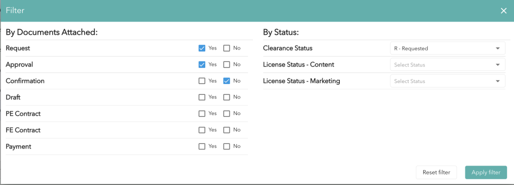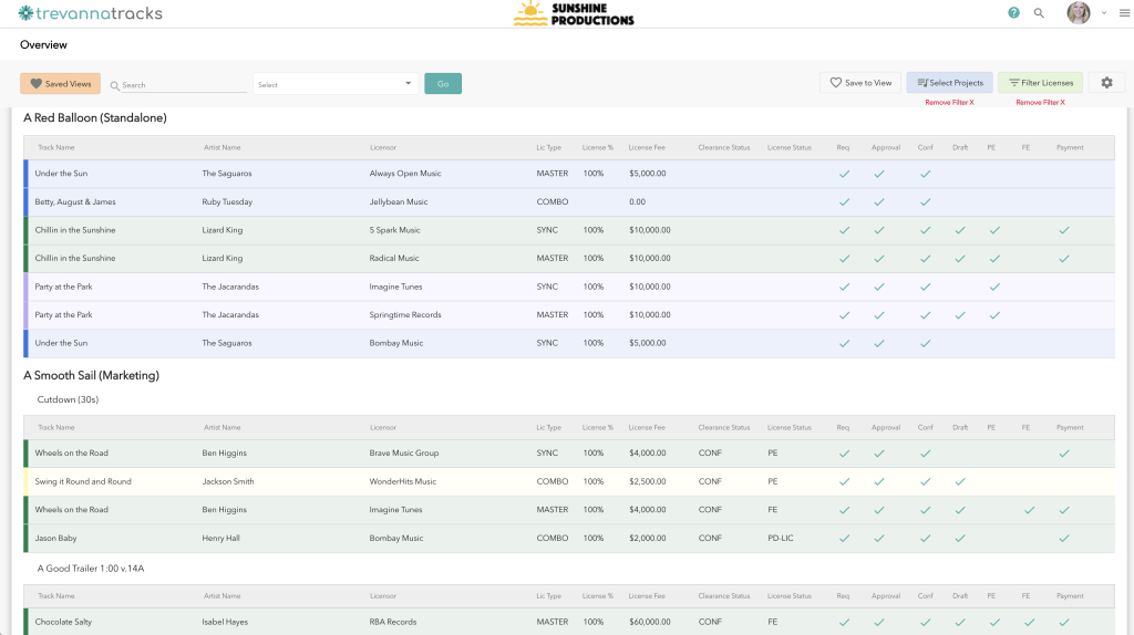 The Overview was designed to provide instant visibility to the status of active licenses across every selected project in a single view, with the ability to color-code and filter licenses based on where they are in the clearance and licensing process.